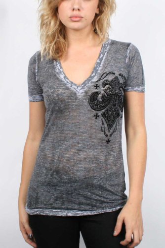 >.< Affliction - Womens Median V-Neck T-Shirt In Charcoal Burnout Wash, Size: Medium, Color: Charcoal Burnout Wash @Now Cheap